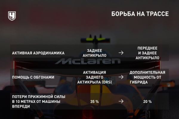 Соответственно, раз крылья могут открывать все, такое понятие, как DRS, уходит в прошлое. Пилоты больше не будут использовать при обгонах помощь крыла. Однако это не значит, что никакой помощи не осталось: теперь если в точке детекции в конце круга преследователь оказался менее чем в секунде от соперника, то затем целый круг он сможет использовать так называемый «режим обгона» — то есть дополнительную мощность силовой установки. Поможет ли? Да чёрт его знает. Некоторые пилоты опасаются, что если используют «обгон», то просто очень быстро израсходуют заряд батареи — пока будут её перезаряжать, то без борьбы пропустят соперника обратно.