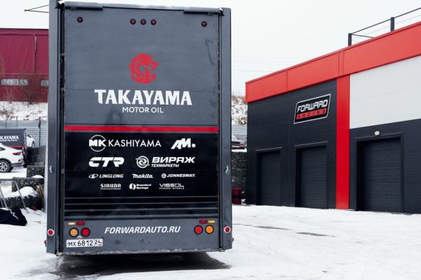 Спецификой Takayma Forward Auto можно назвать организацию её работы. Коллектив базируется в Красноярске и не имеет базы в Москве, так что с учётом географии возможности после каждого этапа возвращаться в Сибирь для обслуживания машин нет. В итоге в межсезонье коллектив снаряжает грузовик всем необходимым инструментом, запасом запчастей и вместе с гоночными автомобилями отправляется в масштабное турне по стране. Перед каждым этапом дрифт-кары проходят подготовку уже на трассе, где будет проходить уикенд, а масштабные работы планируются на этап на «Красном кольце» и уже после окончания сезона. Занимаются всем этим примерно 40 человек.