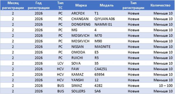 Эксперты агентства «АВТОСТАТ» и Объединенной Лизинговой Ассоциации (ОЛА) выяснили, что в феврале 2026 года на авторынок РФ вышло 9 новых легковых моделей, 1 легкая коммерческая (LCV), 3 грузовика и 2 автобуса. Как отмечают эксперты, все 15 моделей впервые появились в продажах новой автомобильной техники.