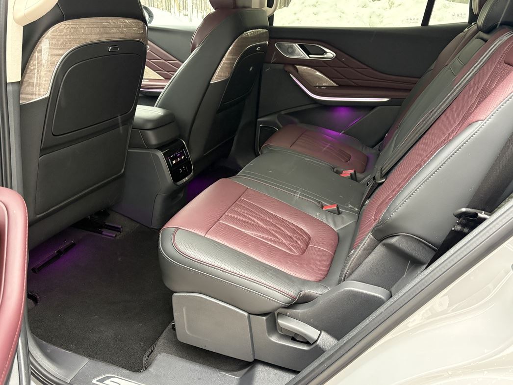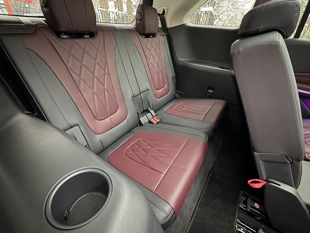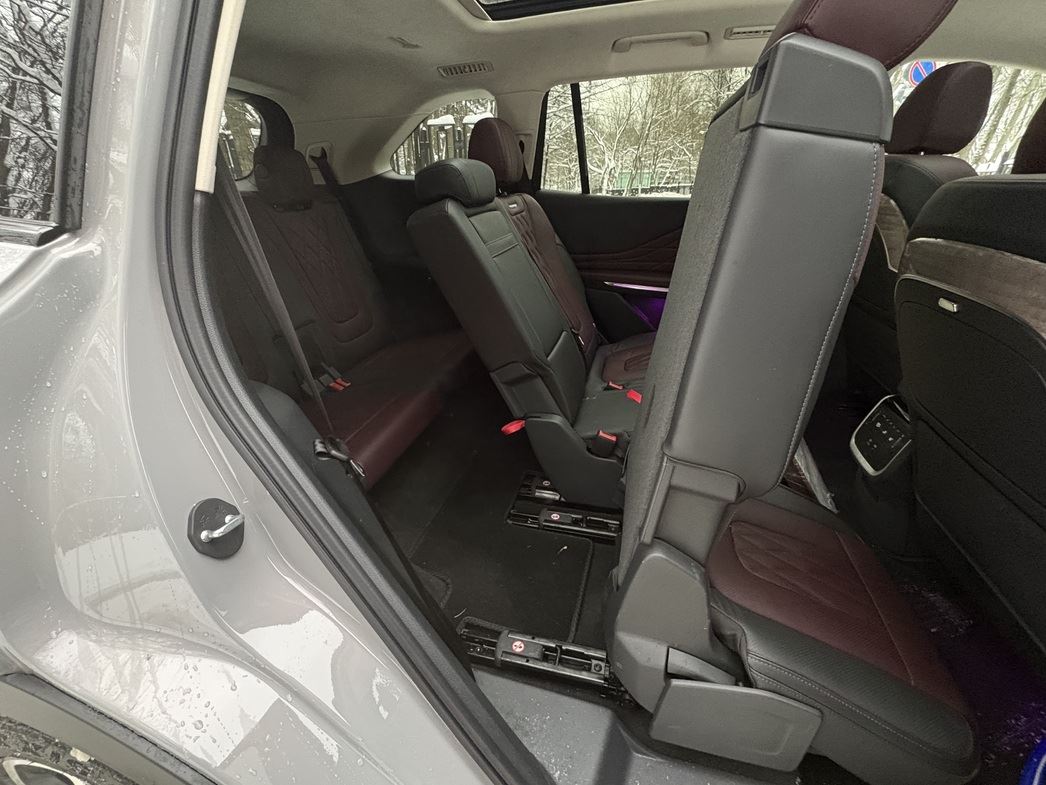 Что касается задних седоков, то во втором ряду — полноценный диван на троих с регулировкой угла наклона и продольного положения. Подушка длинная, пространства — океан (база-то 2920 мм!). А еще в спинках передних кресел — мощные откидные столики с микролифтами, которые удержат даже игровой ноутбук: детям понравится. Вишенка на торте — собственный климатический блок для задних пассажиров.