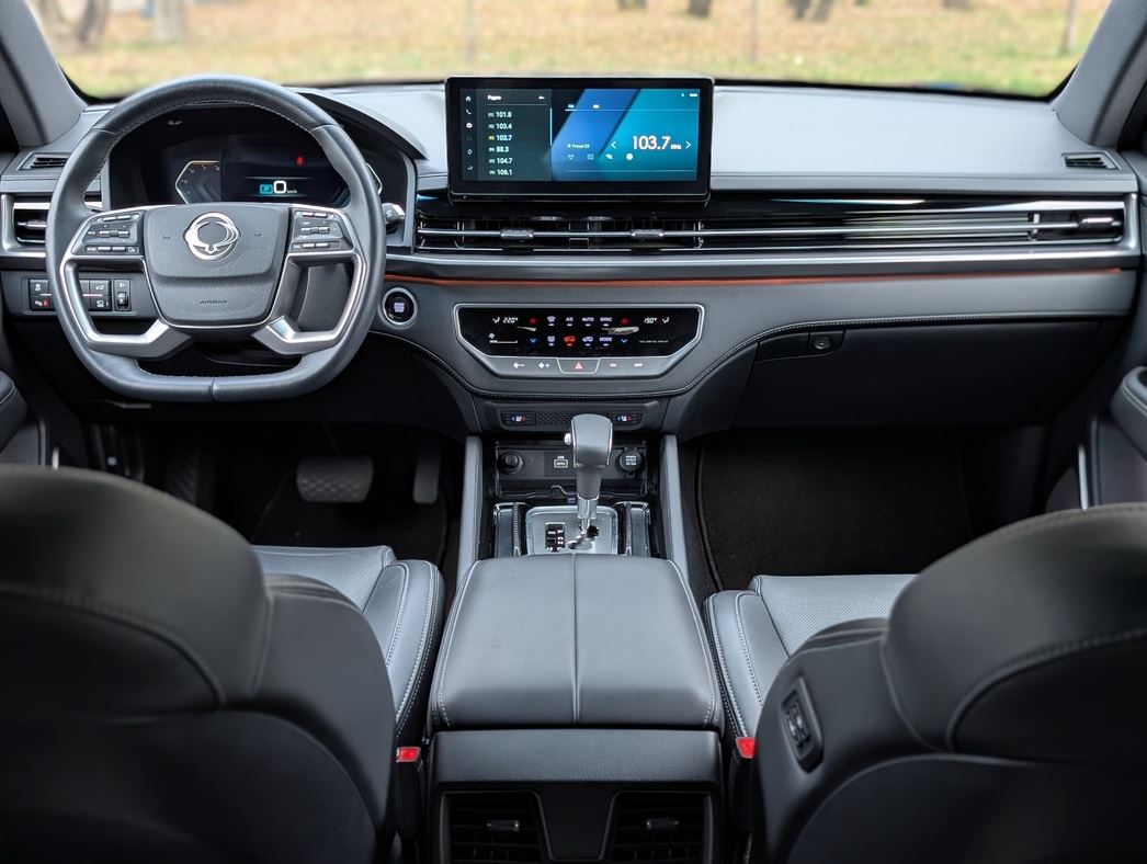 На асфальте Rexton ведет себя предсказуемо и ожидаемо солидно. 2-литровый бензиновый турбомотор (225 л.с., 350 Н·м), агрегатированный с 6-ступенчатым «автоматом» Aisin, не рвет машину с места, а разгоняет ее размеренно и с достоинством. Производитель заявляет расход около 10,4 л/100 км в смешанном цикле, хотя на практике в городе он легко достигает 15-18 литров.