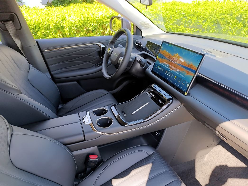 На нее выведена карта навигации, но улиц почти различить. Зато в центре — 14.6-дюймовый сенсорный дисплей. Физических кнопок — минимум. В общем, типичный китайский подход. Россыпь обычных клавиш уходит в прошлое, ибо делать их дорого. Куда легче для производителя собрать всю информацию на мониторе. Старшее поколение такую эргономику будет критиковать, а вот зуммеры точно оценят. Тем более, что процессор стоит мощный. Софт летает. Никаких задержек и дерганий.