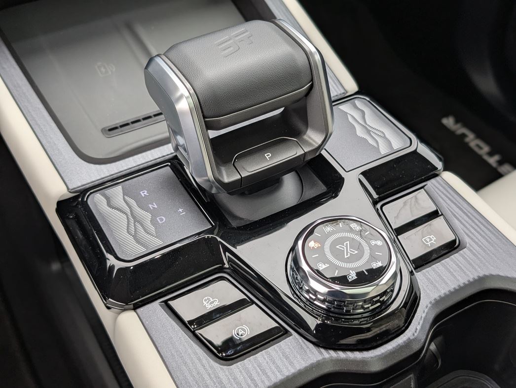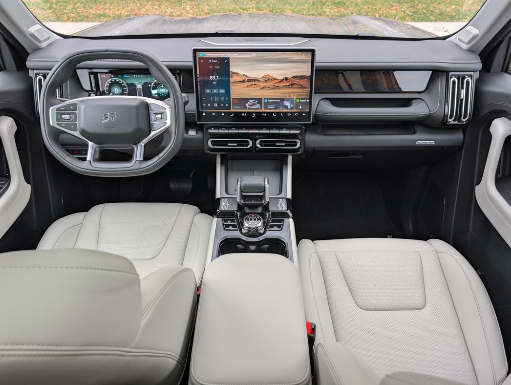 «Баранка» и удобный рычаг АКП со странно расположенной на нем кнопкой «Р» переехали сюда из Т2, как и шайба выбора режимов движения, которых, напомним, в обеих моделях по семь. Да и вообще интерьерно Т1 и Т2 обоснованно и более чем ожидаемо похожи до неразличимости. И тут, и там лаконичная — ничего лишнего — «прямоугольная» архитектура передней панели: цифровая «приборка» на 10,25 дюйма и центральный сенсорный экран диагональю 15,6 дюймов.