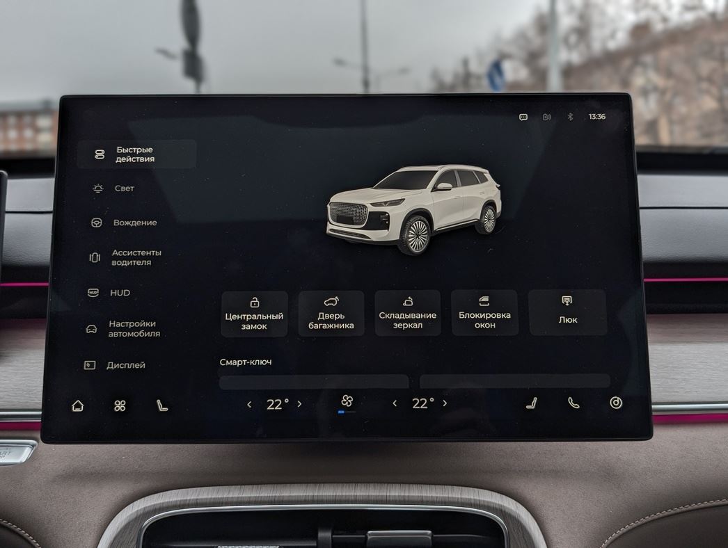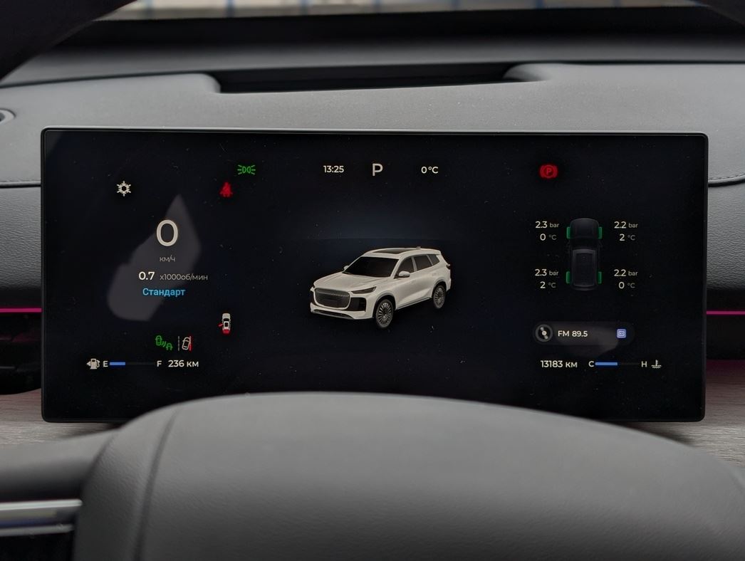 Внутри — тотальная, увы, цифровизация в виде двух экранов приборной панели (10.25 дюйма) и мультимедийки на 15.6 «инчей». Дизайн — минимализм в чистом виде. Физических кнопок — раз-два и обчелся. Даже регулировка зеркал — только через меню на тачскрине. Климат-контроль также настраивается через экран, что на ходу неудобно. Кстати, и функционирует он довольно странно, нередко начиная при выставленных +27 градусах гнать ледяной воздух. Спасение от навязчивой «цифры» — быстрые иконки в «шторке» дисплей, которую можно настроить под себя.