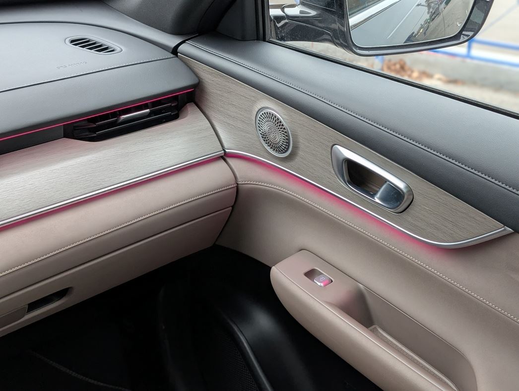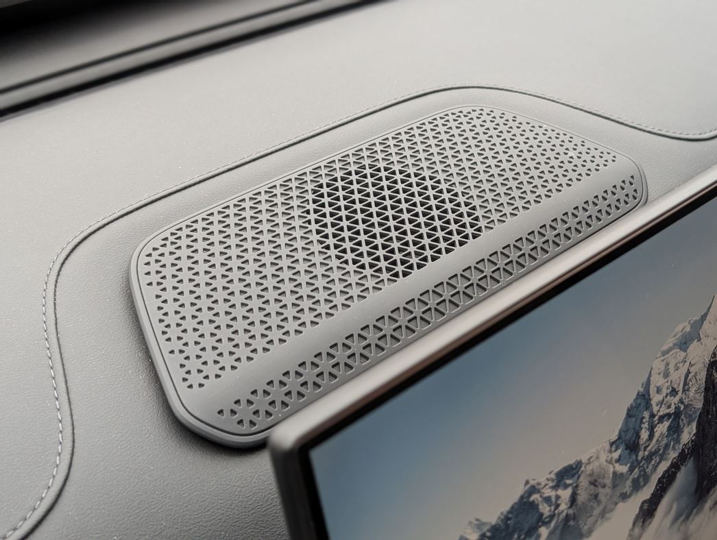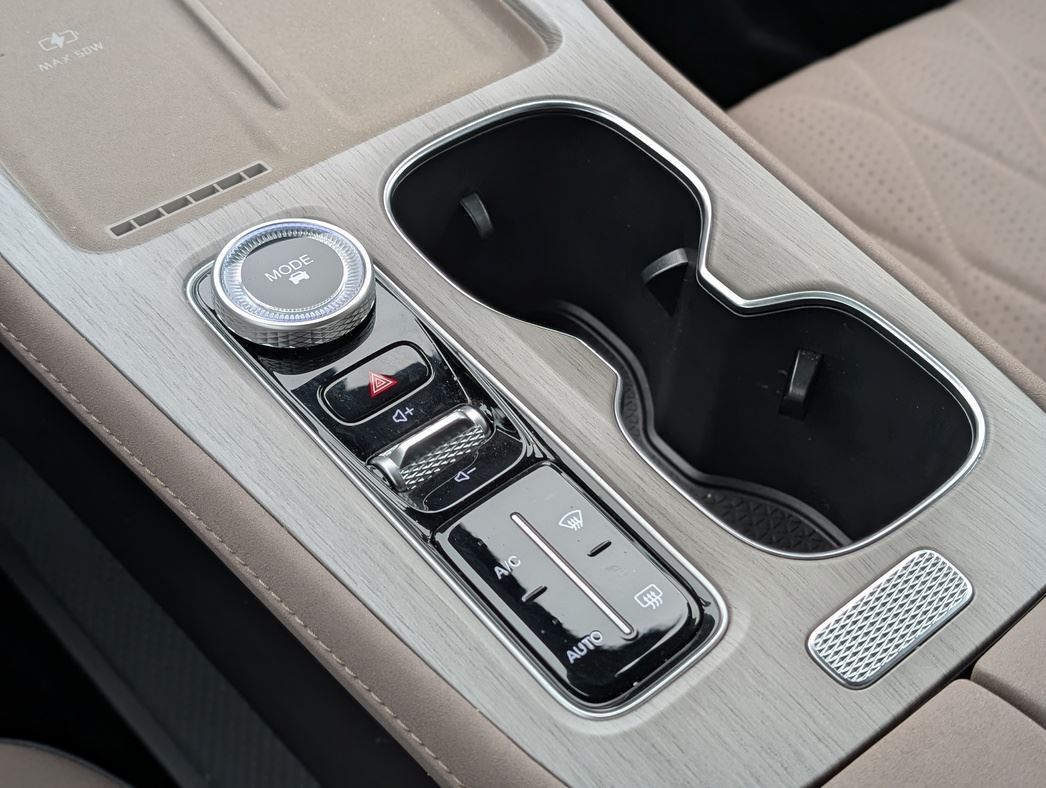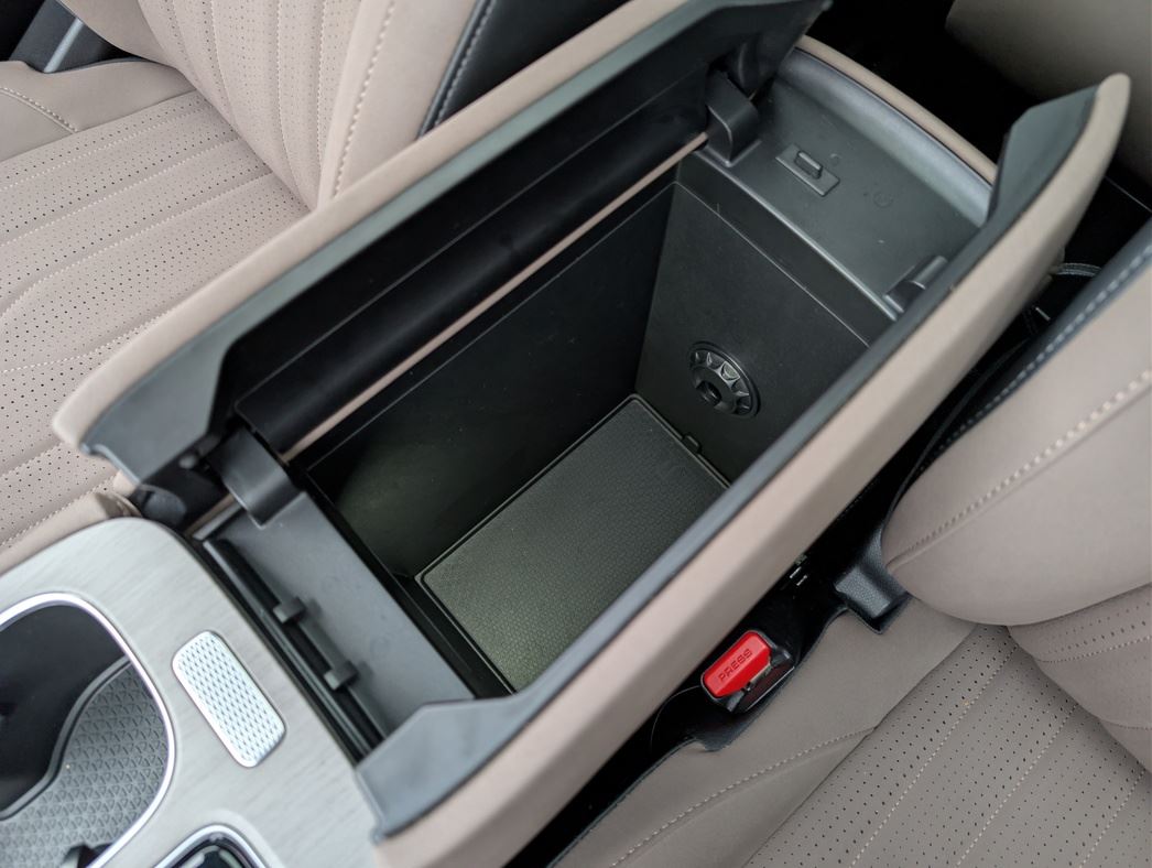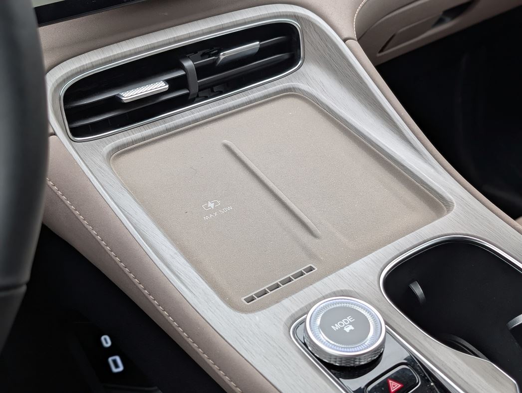 Мягкая искусственная кожа на торпедо, простроченная замша, аккуратный пластик под светлое дерево — все это не скрипит, не люфтит и пахнет не химией, а просто новой, качественной вещью. И сделано все на совесть. Плюсом — беспроводная зарядка на 50 Вт с охлаждением, охлаждаемый же бокс в подлокотнике и хорошо читающийся проекционный дисплей. Аудиосистема Sony на 10 динамиков — не хай-фай, но для большинства ушей — более чем.