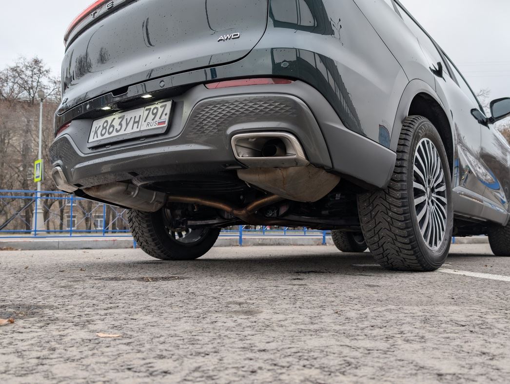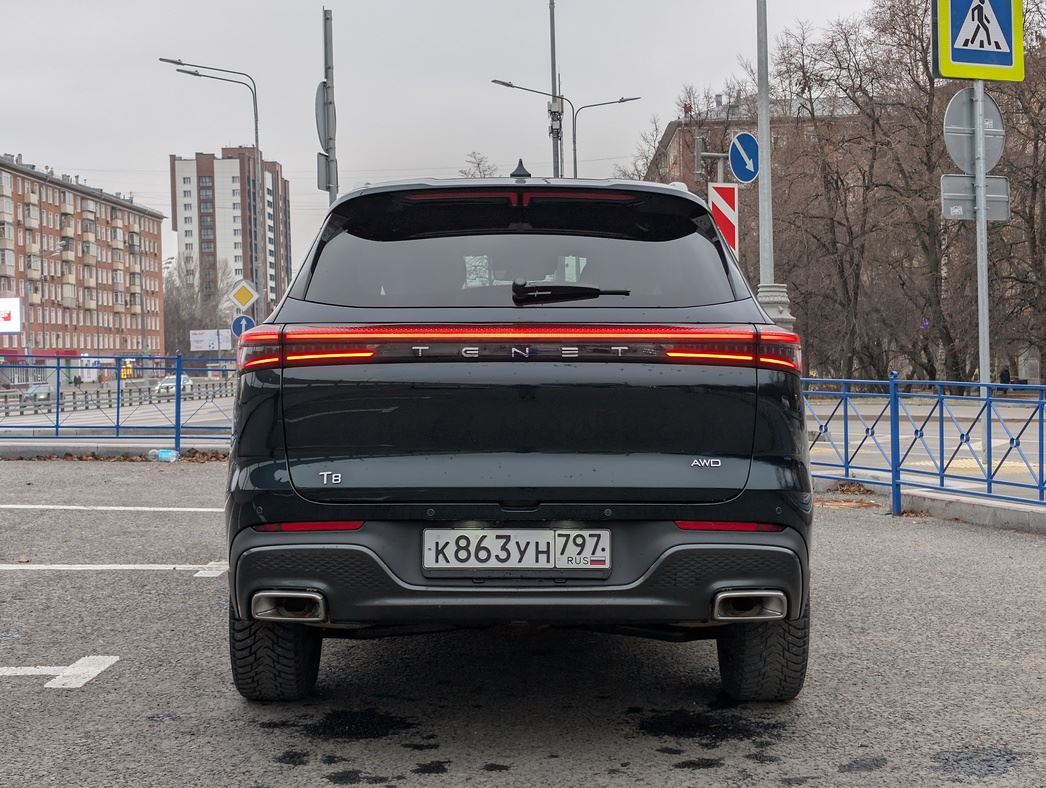 Пластиковые накладки на колесных арках и по низу кузова защищают от мелких дорожных невзгод. Сзади — два не бутафорских, а самых что ни на есть настоящих патрубка выхлопа. В общем, T8 вполне стоит своих минимальных 3 540 000 рублей. Особенно на 19-дюймовых дисках в топовой версии за 3 790 000 «деревянных».