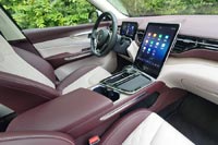 Вертикальная панель приборов выглядит оригинально, но все цифры, кроме показаний спидометра, маленькие, а других вариантов оформления не предусмотрено. Есть проекционный дисплей на лобовом стекле, но он малоинформативный. Мультимедийная система с огромным вертикальным экраном удачно вписана в центральную консоль. Есть беспроводная поддержка приложений Apple CarPlay и Android Auto.