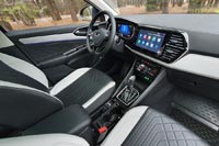 На передних дверях удобные несенсорные кнопки системы бесключевого доступа. Передние кресла на вид простенькие, но посадка удобная. Электропривод есть только у водительского сиденья. Цифровая приборная панель русифицирована, но меню мультимедийной системы на английском языке. Качество изображения с наружных камер по сравнению с современными китайскими автомобилями – неважное. Мультимедиа поддерживает приложение Apple Carplay.