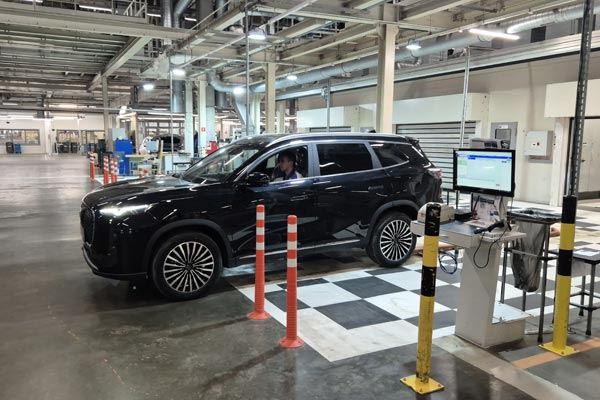 После сборки и финального осмотра в световой камере каждый автомобиль попадает на участок контроля качества. Происходит первый запуск двигателя и сразу первое испытание — проезд искусственных неровностей. После этого проводится дозатяжка резьбовых соединений и контроль и регулировка углов установки колес.