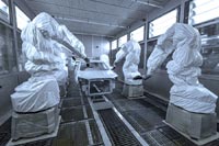 Нанесение катафорезного грунта происходит по технологии RoDip (Rotational Dip Coating): кузов не просто погружается в катафорезную ванну, но и поворачивается при этом на 360 градусов, что позволяет катафорезному покрытию проникать в скрытые и труднодоступные полости. После грунтования кузов просушивается в сушильной камере, затем проходит герметизацию сварных швов и поступает на автоматическую линию окраски.